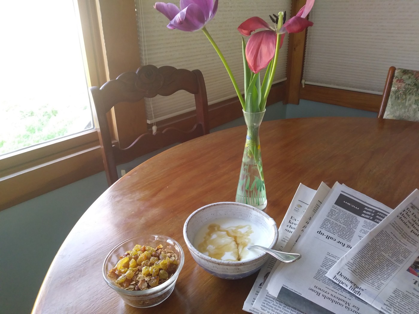 We top our fresh yogurt with homemade granola, which she taught me how to make. Mine had never come out well before, but it really is not difficult once you know the tricks! Store bought granola is pretty expensive, may have ingredients you don’t want and also uses packaging that ends up in the trash or recycling bin.